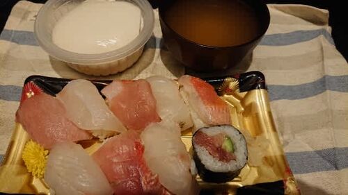 13連勤無事に終了さすがに体は辛かったです腰が痛い、肩が痛い、膝が痛い…50間近の体ですから仕方が無いかなぁもう若くない…さて、今晩も夕飯の時間になりました。当然値引き品での夕飯なのですが…今晩は御褒美も兼ねてちょっとリッチ版にぎり寿司・味噌…